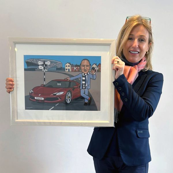 Creating caricatures is always enjoyable, especially when they are as meaningful and personalised as the one I recently completed for Sanjay Gandhi. Commissioned by Regina Mangan from Liberty Blue Estate Agency in Waterford, this special birthday gift was designed to celebrate Sanjay’s passions, values, and the people he loves most. Sanjay is not just a successful estate agent mentor; he’s also a devoted family man, an ardent Tottenham Hotspur (Spurs) supporter, and a car enthusiast. With all these details in mind, I set out to create a caricature that would capture the essence of who Sanjay is.